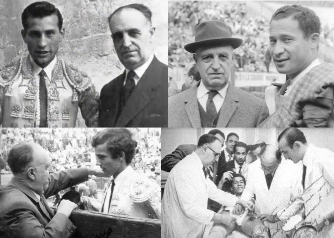 Arriba: El doctor Fernando Claramunt (padre), en compañía de Victoriano Valencia y el venezolano Efraín Girón. Abajo: El doctor Claramunt, médico jefe de la enfermería de la plaza de toros de Alicante, recibiendo el brindis de José Mari Manzanares, el 30 de mayo de 1970 y ejerciendo su función, asistiendo a un herido de una cornada.